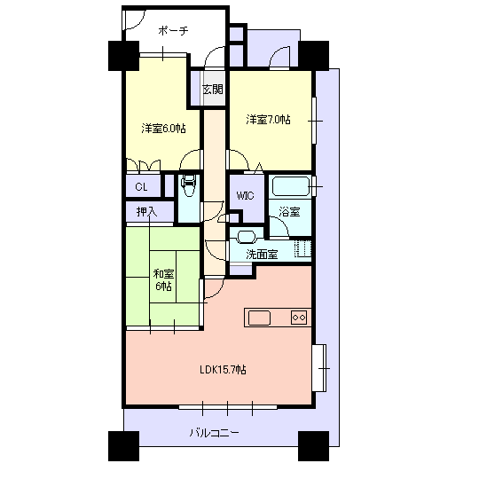 3LDK (洋7、洋6、和6、LDK15.7) |